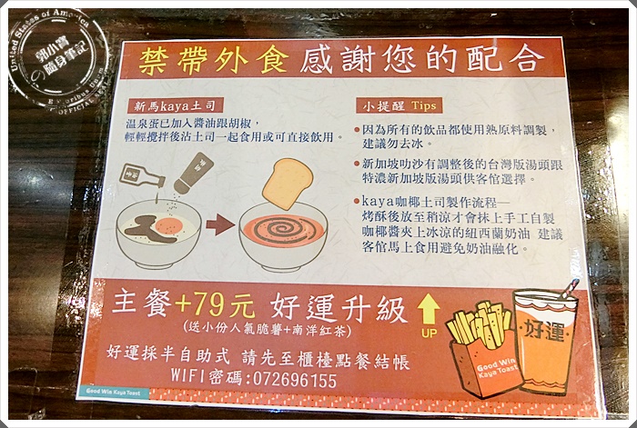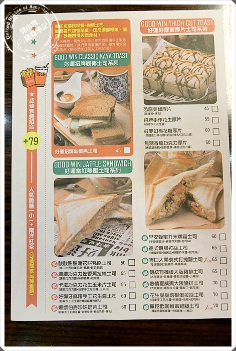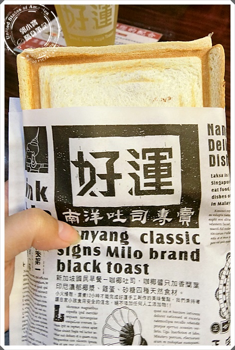 | 點餐單設計得很有報紙的氛圍~好運的招牌是咖椰吐司,沾醬是使用了砂糖、雞蛋、香蘭葉、以及椰漿下去混和,以吐司沾取來吃,但寶妹真的是對椰漿過敏= =,所以一向都是轉往熱壓吐司進攻的,有鹹食也有甜食可以選擇。 |