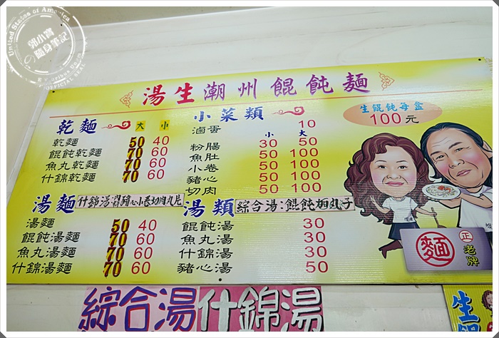 | 賣的東西品項很簡單也很單純,怎麼看就是魚丸、餛飩、豬心、小卷,還有綜合版的什錦~也有提供生餛飩的外賣每盒100元,點餐前一定要先問問還有沒有餛飩,寶妹撲空兩次就是都不夠早來,每次都是餛飩已完售,又不想吃別種麵只好含淚離開~ |