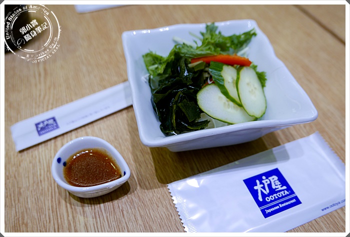 | 首先是香酥雞排鍋的定食附餐沙拉,寶妹一直很喜歡他的油醋醬,還有顧著拍照的時候還打翻了油醋醬XDDDD服務人員立刻補上一份來給我,整個就是貼心阿^^ |