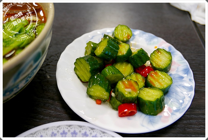 | 涼拌小黃瓜,切得相當漂亮,顏色也不錯,不辣不酸,只能說相當清爽可口,咬起來脆度相當足夠,超級適合配上一碗牛肉麵。 |