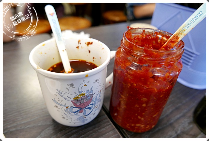 | 牛肉麵店不可或缺的辣油以及辣豆瓣醬。其實還有所謂人人搶的辣酸菜在櫃檯旁邊....寶妹完全沒有發現這件事情直到都吃完了去洗手間才發現(殘念阿) |