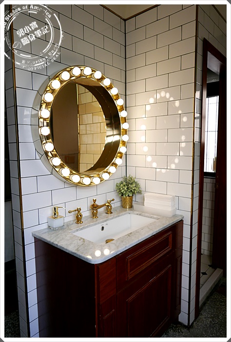 | 到樓上去使用廁所我才知道,永心鳳茶連洗手間都是舖金的XDDD,太威了啦!質感超棒的洗手台~,就連牆邊窗框都是特別鑲上金邊~讓人嘆為觀止!! |