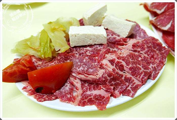 | 這樣的是一份350的霜降牛肉,建議朋友如果單吃牛肉一次叫半斤比較划算,雖然店家都會說兩盤一份跟半斤式一樣的,但是寶妹點過就是覺得實際分量不划算,所以要吃就直接點半斤絕對是必選,上面都還會附上豆腐、番茄、酸菜,肉盤上桌之後要先放進湯底一起煮~ |