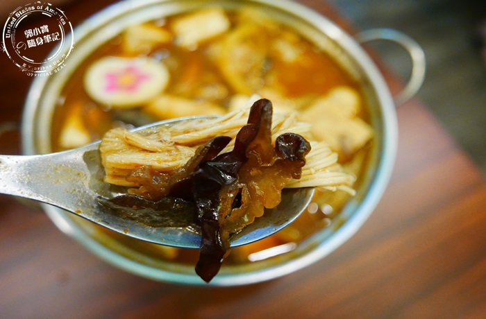 | 配料黑木耳絲、金針菇。這兩樣就是比較養生一點也是必吃的菇類,煮過後都吸足了湯汁增添了香氣但不失原味,本身原有的脆感讓口感層次更豐富,很簡單就很好吃。 |