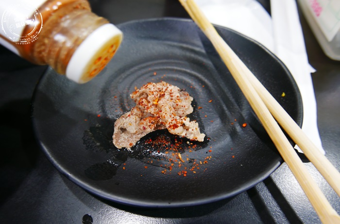 | 或是也可以選擇撒七味粉,桌上都會擺放一瓶七味粉,很日式的調味料,北編也獨愛七味粉的香氣,因為覺得壽喜燒本身的湯頭就很夠味,涮出來的肉片簡單用七味粉調味,吃起來就很好吃了,就是比原味再多一點點的辛香,盤子上這一塊是剛涮好的牛肉,怎麼感覺涮過縮水蠻多的。 |