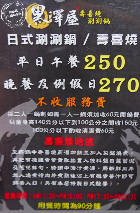 | 店家的菜單很簡單,就是鍋物吃到飽,湯頭就分成日式涮涮鍋跟壽喜燒兩種,價錢還蠻便宜的,而且不收服務費,但有限制用餐時間,不過其實一個半小時也很夠了。 |
