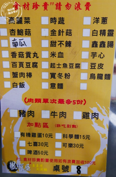| 翻到背面就是所有菜單上的選項,菜色就這些說多也不算太多但也不是很少,北編覺得其實很夠吃了,比一些吃到飽的東西琳瑯滿目的可是會吃的就只有那幾樣而已,相較之下這些用點菜的菜色,北邊覺得來的新鮮多了,而且基本的肉類蔬菜跟火鍋料都有,想要吃的麵食白飯也通通都有,其他比較高單價的可以加點,就不算在吃到飽裡頭。 |