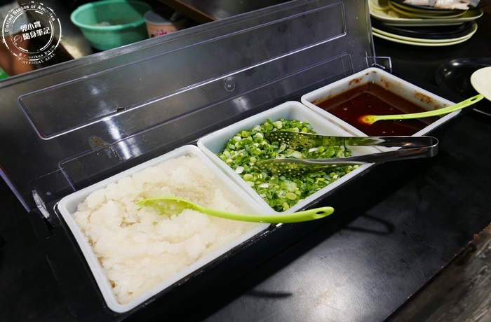 | 也有提供醬料,蘿蔔泥跟蔥花還有沙茶醬,份量都擺的蠻多的,用完店家還會再補,但北編覺得壽喜燒其實就很有味道,不沾醬也好吃,但是喜歡沾醬的朋友,這裡這些基本的醬料都有,大家酌量使用喔! |