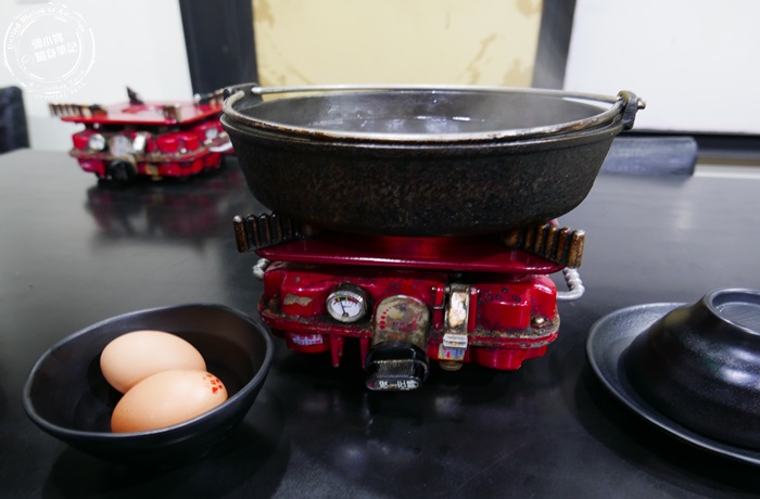 | 入坐後告知店員決定好吃什麼鍋,這次北編選壽喜燒,沒多久店員就會把你要的鍋送上來,桌上的有機雞蛋是算人頭的,幾個人就給幾顆,店家用這種比較輕巧型的瓦斯爐,很方便也不會有管線的問題。 |