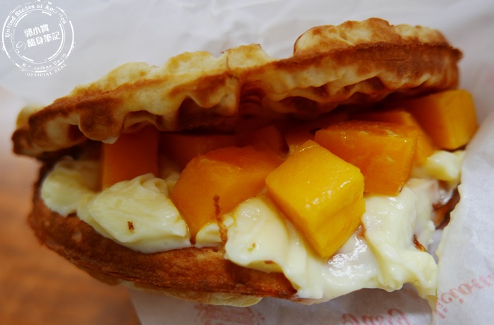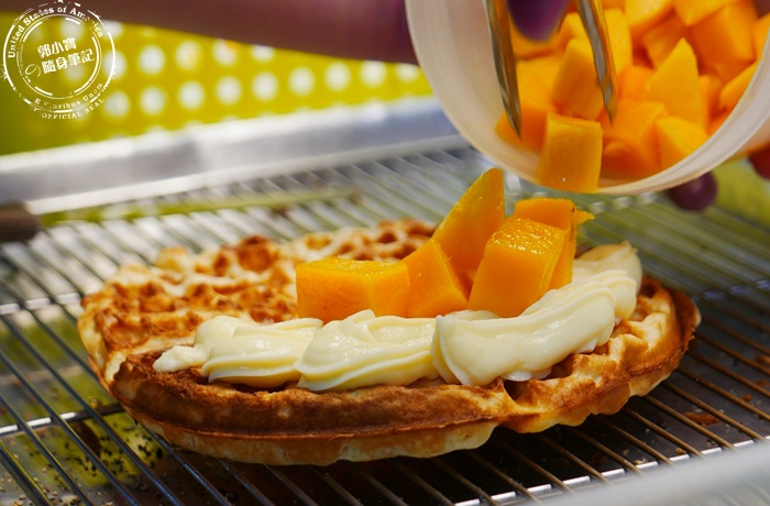 | 接著是甜的口味的鬆餅,滿滿的芒果大平台,好霸氣好新鮮啊!老闆使用的是愛文芒果,香氣足芒果甜,夏天吃最棒了,可是現在已經接近夏天尾聲了,芒果的產季也快沒了,如果大家來的時候很不巧沒有芒果,還是可以吃吃其他口味喔!或是等冬天開始有草莓的時候,新鮮的草莓夾在鬆餅裡頭,畫面光用想像的就流口水了。 |