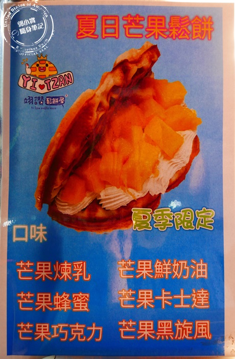 | 一靠近攤位就被這一張傳單吸引,是夏季限定的口味,芒果一整個也太吸引人了,鬆餅裡面加新鮮的芒果,艾編還真沒吃過,以往鬆餅最常吃的口味就是加奶酥、巧克力、煉乳、蜂蜜之類的,第一次看到加新鮮水果,當然一定要來吃吃看。 |