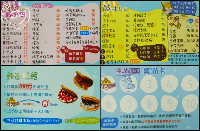 | 他們家的菜單也好可愛,少女心大爆發,甜的口味也有鹹的口味,種類好豐富,不知道要從何下手,價錢也不貴,當點心或當正餐都很棒,滿200就可以外送了,還能用LINE訂餐超方便的啊!而且還有集點卡可以集點,每次購買一份可以集一點,滿10點就可以兌換$50的商品喔!好貼心兒~超適合我們這種愛吃甜食的女孩兒 |