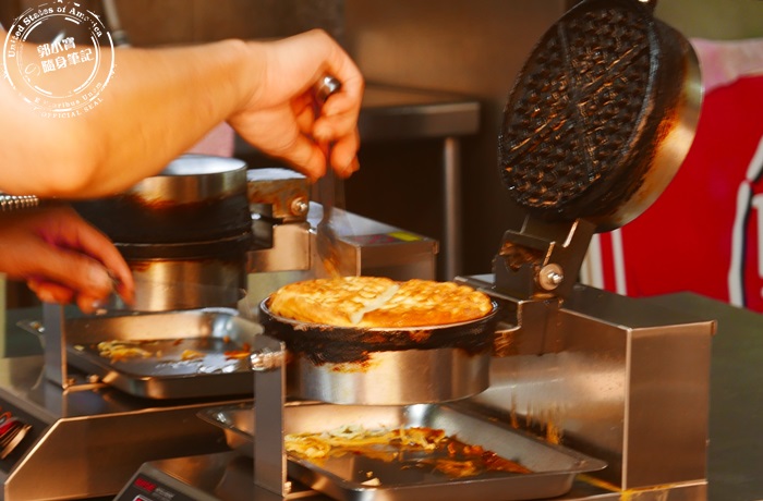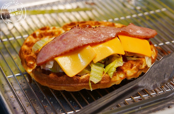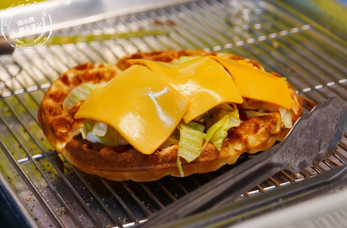 | 鬆餅一出爐,就會移置工作平台上加料囉!除了鋪滿滿的生菜之外,還霸氣的放上三片起司,起司控看到這畫面都要暴走了,起司這東西太有魅力了。 |