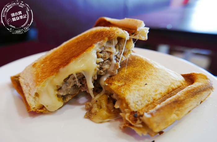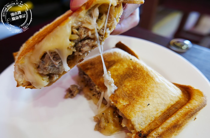 | 好強大的熱壓吐司,份量其實不小,當下午茶非常的適合,裡頭的內餡都爆漿出來了,霸氣的塞滿牛肉跟起司,這切面實在太罪惡了,融化的起司好逼人,印象中以為熱壓吐司都會對切成三角形,但他們家是直接從中間切,重點切得很漂亮,吐司都沒被壓扁的感覺,從中間切起來更能感受到像盒子一樣四四方方,吐司烤過的顏色更迷人。 |