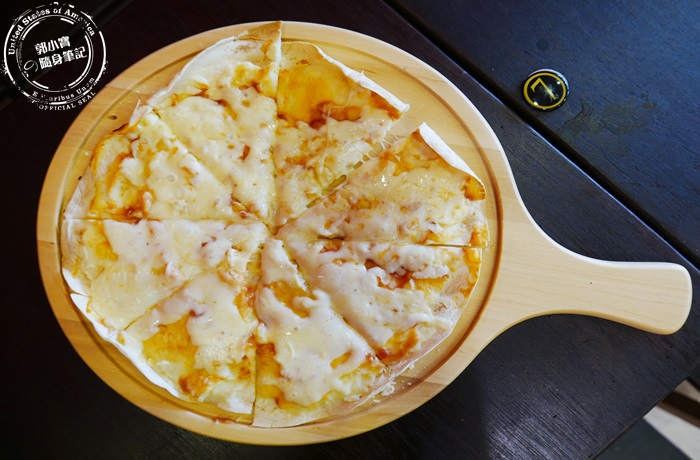 | 這個披薩才$90整個好超值,而且還是用Pizza的木質專用盤盛裝,瞬間質感大提升,他們家的披薩皮是很薄脆的,很像一般吃捲餅的那種餅皮,很薄很薄但也是很有口感,最外圍烘烤過的部分非常的脆,塗上滿滿的薯泥,雖然不是很厚的那種,但也是有點厚度,重點是還有大量的起司,只是配色上沒有很美味的感覺,應該是薯泥披薩的關係,若是能在起司上方撒些異國香料或是放上一小撮綠色植物,感覺會更棒,不過看上去還是蠻可口的,光是那起司就會讓人流口水。 |