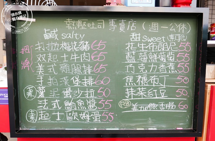 | 工作區的攤子上有個大大的黑板,寫滿了熱壓吐司的口味,真的是用粉筆寫上去的,好有回到校園的感覺,其實這家店以前是在西子灣中山大學附近,專賣熱壓吐司,宵夜時段很受歡迎,後來他們搬家來的鹽埕區開啟了新店面,位置算小隱密,竟然被艾編不小心的發現到,店名的燒K啊,其實挺有意思的,是台語的燒盒子音譯,把吐司裝在鐵盤模具裡面放在火上烤,烤完就像個盒子的形狀一樣,如果只是想要外帶熱壓吐司,直接看黑板上的菜單點餐就可以了,鹽埕區這裡還是保有以前的懷舊樣貌,和一些小店可以走走逛逛,所以拿著熱壓吐司這樣的口袋美食散步逛街也是挺好的。 |