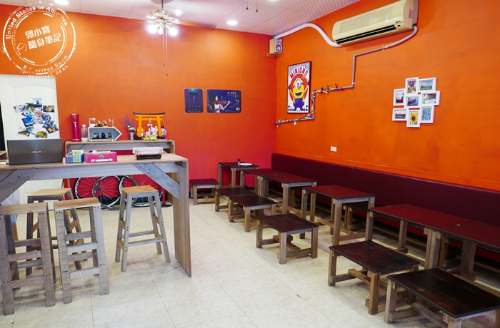| 內用空間牆壁刷滿亮眼的橘紅色,給人一股熱情奔放的感覺,就像熱壓吐司一樣的火熱,木製的桌椅直接靠牆壁一整排,黑色系又讓人有一種神秘低調頗有質感,中間吧台的區域是他們員工的使用空間,這裡真的超適合一群人來這裡坐著聊天吃東西,而且他們價格很便宜,內用空間又有冷氣吹超舒適的。 |