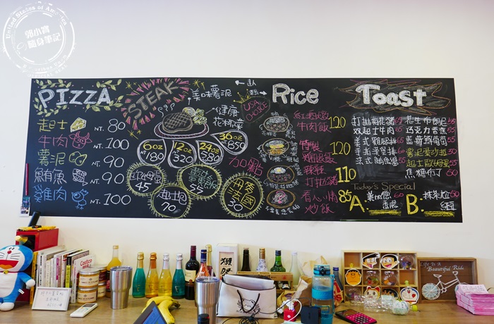 | 店裡面還有另一個高掛在牆上的菜單,這黑板更大菜色更豐富,塗鴉的風格有種來到美式餐廳的感覺,除了有基本的熱壓吐司外,還多了披薩、牛排、飯類,種類很多而且價格還蠻便宜的,想吃正餐類或輕食都可以選擇,下方平台也擺了蠻多的收藏品(雜物請忽視),這面牆看起來就很豐富。 |