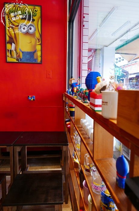 | 落地窗這邊也有裝潢上的小巧思,特製的多層櫃平台上擺滿了很多的裝飾品,收藏品啊!公仔啊!擺放在上面形成一道很繽紛的牆,很吸睛很好拍,牆上掛著小小兵的圖片更顯亮眼,讓這小小的內用空間變得很熱鬧有趣味。 |