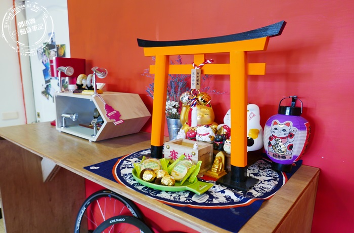 | 店裡面的某些角落都能感受到店家用心的佈置,像這個平台艾編就還蠻喜歡的,很有日式的感覺,這鳥居好顯眼,上面的小盤子有放一些點心糖果餅乾,不曉得是不是要給客人吃的,但又有點像在拜拜的感覺,挺可愛的。 |