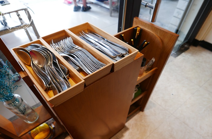| 門口的左手邊是放置餐具的地方,還有一些調味料,只是一個小小的平台也能賦予這樣子的質感,乾淨整潔,在這家店的每一個角落每一個細節,都能感受到店家的用心,喜歡一家店有時候就是一種環境氛圍的感染力,一種被療癒的心情,我想~他們家就是這種感覺。 |