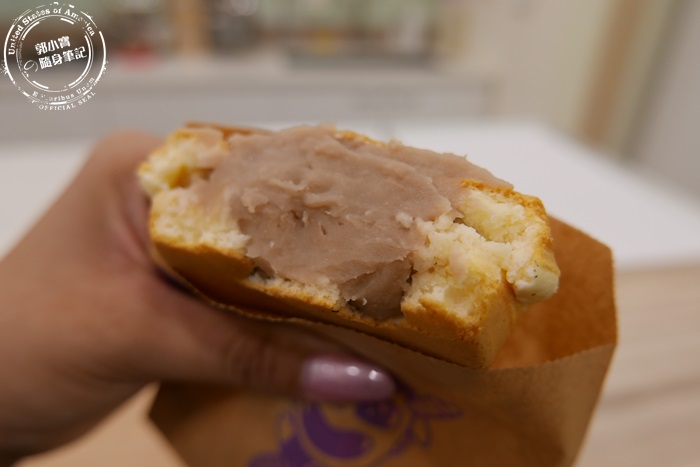 | 芋頭的內餡也是多到爆炸,而且感覺得到真材實料,似乎完完全全就是用芋頭壓製成泥,口感軟綿細緻,芋香十足不會太過甜膩,是艾編相當喜歡的芋泥,大家絕對不難發現,那中心點的外衣,沒咬上一口那內餡因擠壓就噴發一次,在吃的過程中,好幾次都覺得快Hold不住那爆漿的感覺,這個比一些外面的芋泥蛋糕捲還要好吃,而且方便快速許多,重點又不用買一整條怕吃不完,這樣一個紅豆燒就能滿足甜點胃。 |