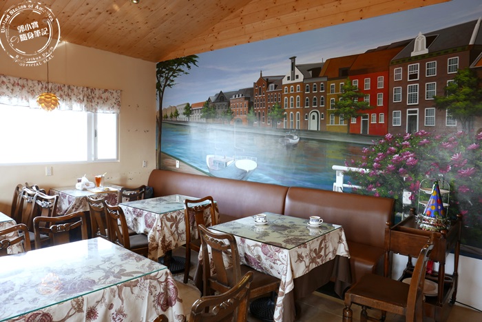 | 雖然外面看起來這裡很像很大,不過開門看到裡面的空間,並沒有想像中的寬敞,裡面有木屋營造的鄉村感,整個桌椅的擺飾也都很歐風,超大的壁畫配色強烈,視覺效果很棒也很吸睛,還蠻喜歡這樣的環境,感覺很舒服。 |