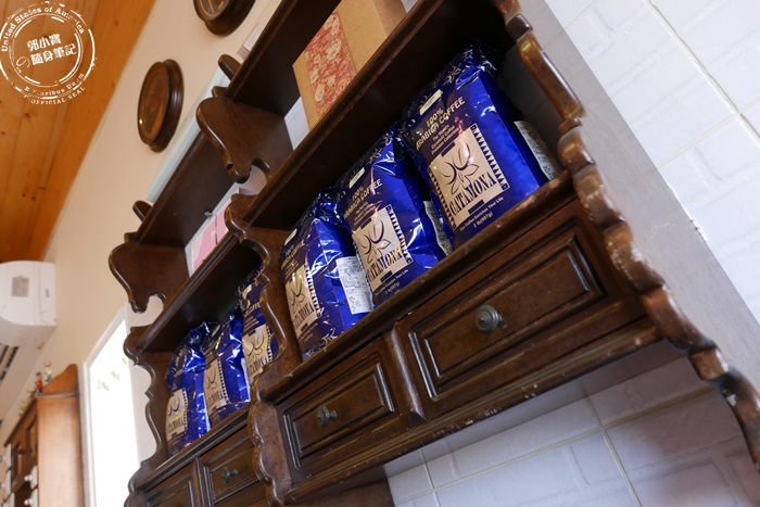 | 牆上櫥櫃放置ㄧ整排的咖啡豆,應該是店家自家用的咖啡豆,艾編喝他們家的咖啡還不錯,有興趣的可以問老闆有沒有販售吧! |