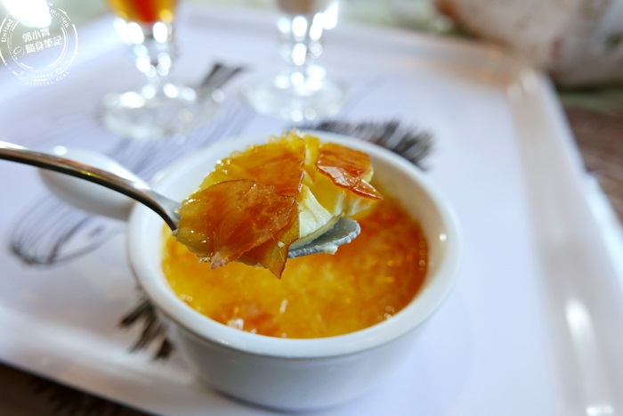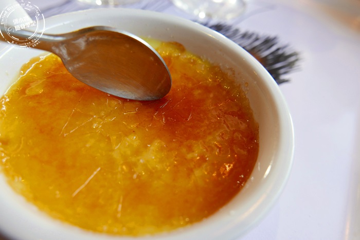 | 這個是直接從冰箱點的沒有在菜單上,也是店裡最熱賣的商品,點餐之後老闆就會在烤布蕾上頭撒上砂糖,再直接火烤直到呈現焦糖色,冷卻之後就會變成薄薄的一片焦糖,吃的時候可以用湯匙在上面敲幾下,有一種破冰的感覺,清脆而動人。 |