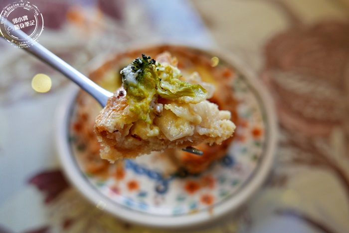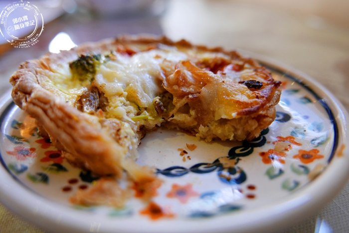 | 現烤出來的法式鹹派,外皮非常非常的酥脆,跟在澳洲吃的鹹派是不一樣的,因為剛烤起來的緣故,除了外皮的酥脆鬆軟,還有裡頭蛋液跟餡料的軟綿,口感豐富,裡頭的蛋液包裹花椰菜蕃茄還有燻雞肉,再加上一點點起司,鹹香夠味酥香美味,吃起來不會太乾太硬,味道很好而且燻香氣味十足,這鹹派雖然份量不大,可是用料非常的實在,整體搭配起來很好吃,尤其熱熱的更香更美味。 |
