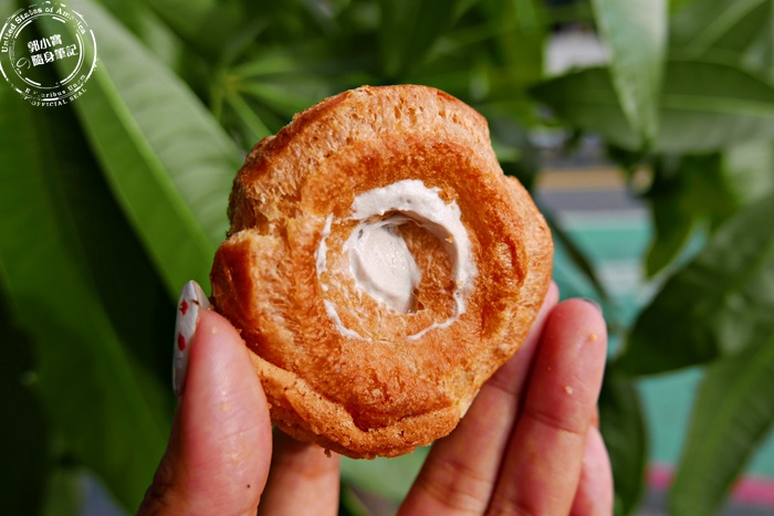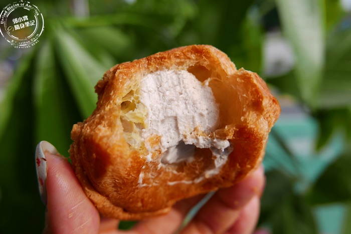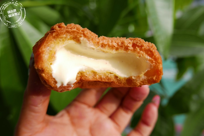 | 這個一咬會爆漿的泡芙太驚艷了,裡頭的牛奶餡像是奶昔一樣,溢入舌尖感受濃郁香氣與柔潤綿滑,濃濃的奶香及香草味,少女心大爆發啦!超好吃吃舒服的,不過泡芙吃到的時候是冰冷的,所以外皮看起來很像菠蘿麵包的酥皮,其實不會很脆,就是甜甜香香柔軟的泡芙外衣,整體搭配起來還算好吃,不過外皮能夠酥脆的話就更好了。 |