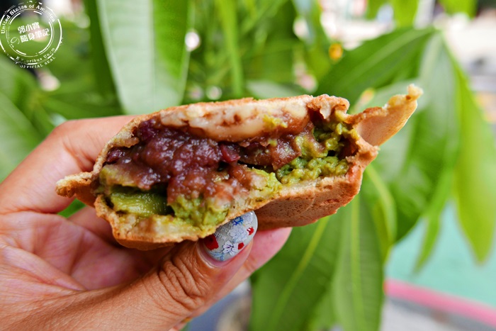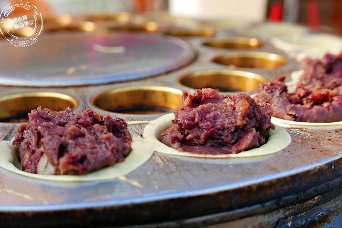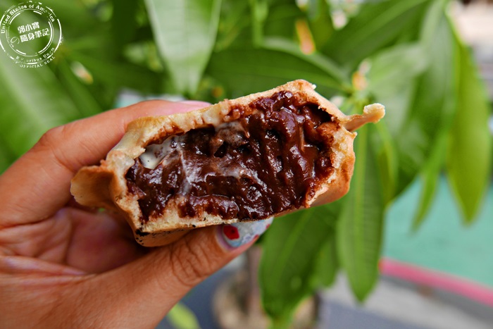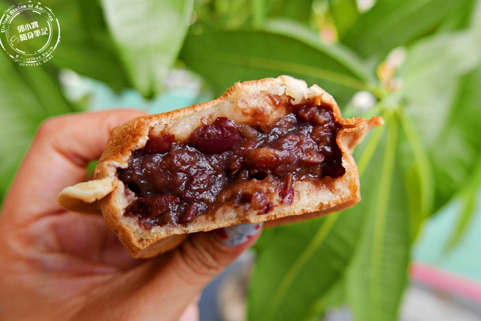 | 滿滿的紅豆餡,手工自製的除了紅豆還添加大紅豆,老闆娘說這樣子的口感比較好味道也比較香,用料是不是超實在的,但在一旁觀看的艾編,發現他們家作法跟之前介紹過的脆皮紅豆餅不太一樣,沒有把做好的上蓋放涼,覺得酥脆度應該多少有影響,不過沒關係,東西好吃就行了。 |