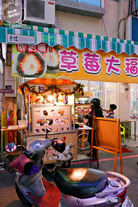 | 富國路上也是很熱鬧很好覓食的一條街,路過此地都會放慢速度,來看看有什麼樣好吃的美食,所以發現了這一家很常見到的麻糬,可是他們家又沒有那麼多普通的感覺,陸續也蠻多客人上門排隊的,肯定有什麼樣的魅力,高掛的布條寫著大福草莓,這可是專屬冬天的美味呀!女孩兒就是無法抗拒那草莓的誘惑,所以艾編也跟風去了,這家小攤販在富國路與立信路口轉角處,後方店家一邊是素食人家,一邊是50嵐,他們家的攤位明顯,不怕找不到,只是這裡馬路不大,只適合路邊臨時停車,採買完速速離開。 |