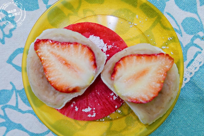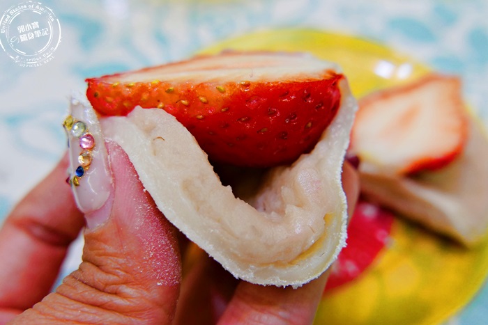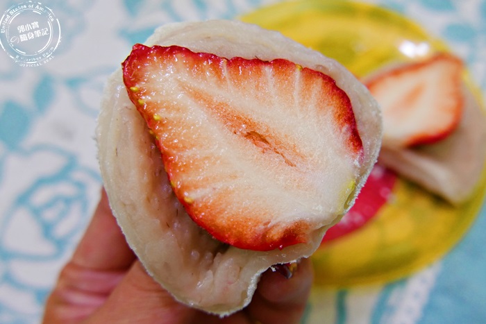| 大福的外衣比較薄,艾編特地挑芋頭內餡,雖然印象中草莓大福好像都是跟紅豆餡搭配在一起,不過他們家內餡有3種可以挑選,還蠻好的,芋頭餡跟麻糬皮就像是個柔軟的被子一樣包覆著香甜的草莓,輕輕淡淡的綿密芋香,加上軟Q的麻糬皮,口感香甜有嚼勁,不膩口帶微酸的味道,忍不住一下子就吃光光了,第一次有大福讓艾編我吃完會覺得想念的,就是他們家了,太好吃了。 |
