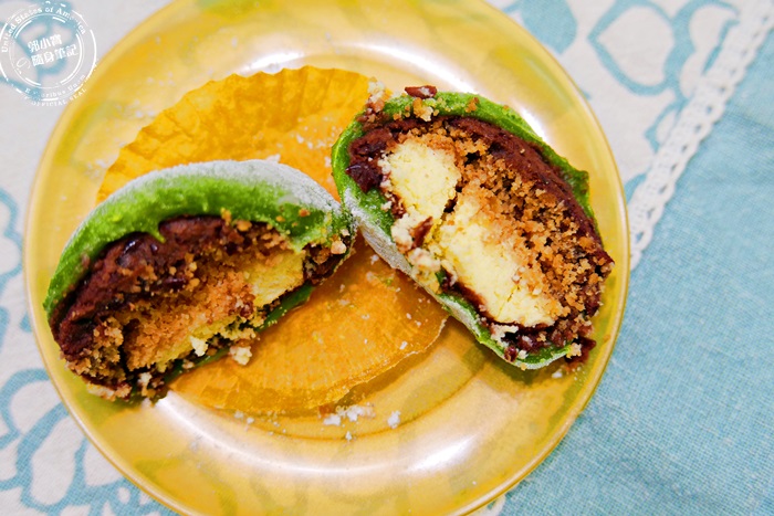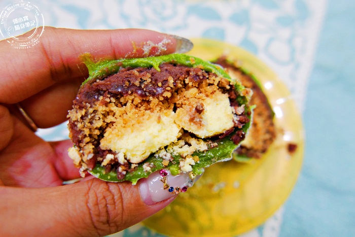 一切完就碎的亂七八糟的,不過還是看得到裡面乳酪蛋糕的樣貌,除了乳酪還有像消化餅乾碎碎的酥鬆口感,乳酪的奶香蠻厚實的,綿密香醇,紅豆餡料香甜,抹茶麻糬軟Q,茶香舒服,麻糬裡面包乳酪真的蠻特別的,意外的和諧好吃,不會太甜膩,相當不錯唷!