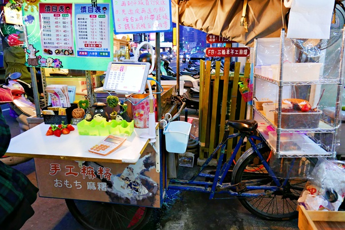 | 真的是三輪車唷!整個好特別,說實在的,要不是他們家賣的東西超多,也不需要那麼大的空間,有時候路邊都會發現賣麻糬的攤子都是小小的而已,他們家真的算大,超齊全,東西超多。 |