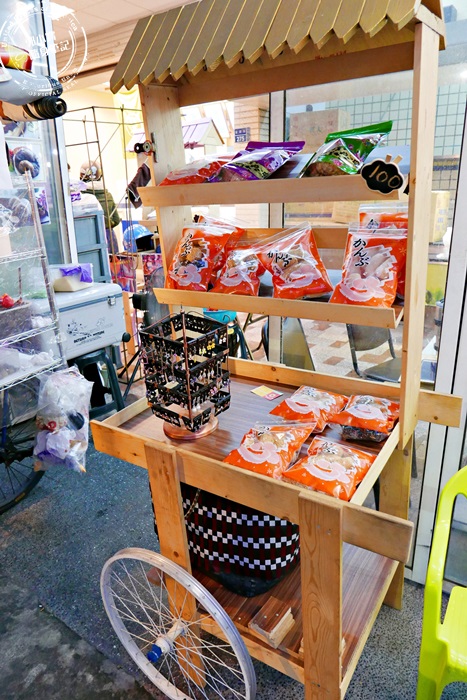 | 旁邊的展示櫃有販售收工麻荖,木頭打造很有特色,也有三輪車的概念,小小一個攤子什麼都有賣,就是點心天堂來著。 |