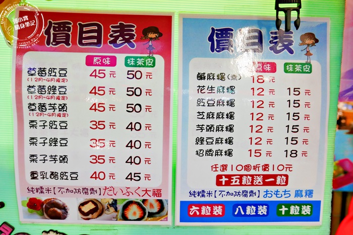 | 麻糬的口味還蠻多的,皮的部分有原味的跟抹茶的可以選擇,有一般的麻糬也有包比較特別的餡料份量大的,跟包著草莓的大福,純糯米不含防腐劑的健康麻糬,價格也不是太貴,因為真材實料的,所以這價錢挺合理的。 |