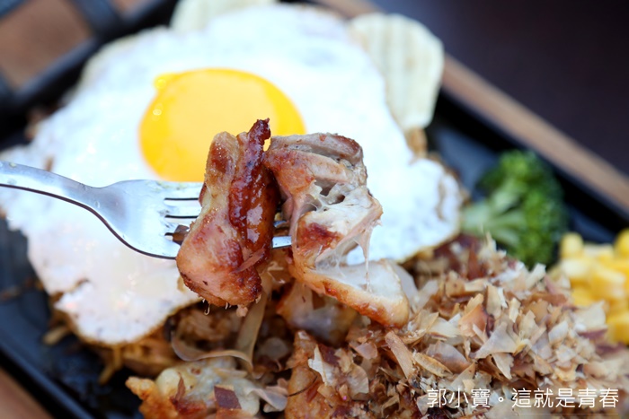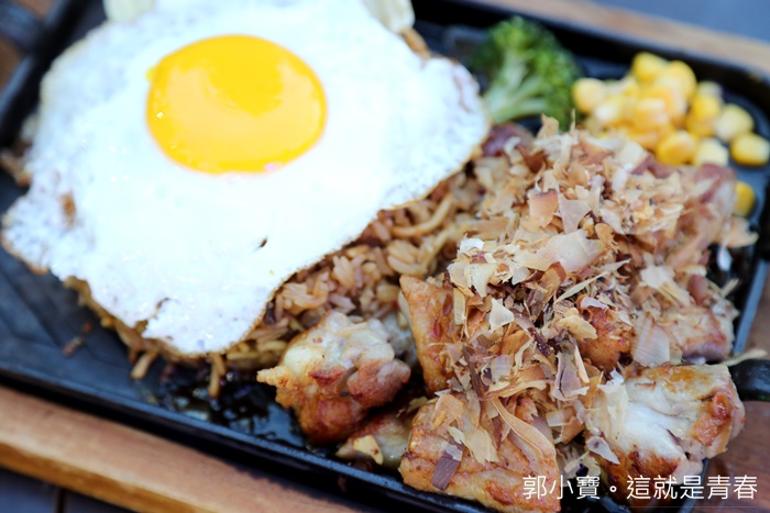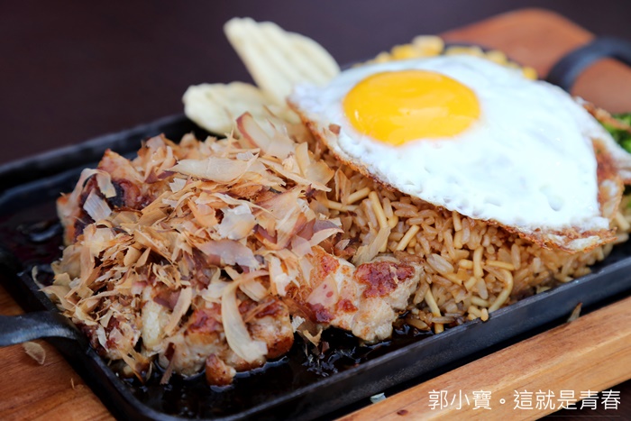 | 友人點的照燒雞炒飯麵,上面灑滿了柴魚片上桌的時候還跳著舞,視覺效果還滿好的,使用的鐵板帶點日式風格,是方形鐵板還滿好看的且空間也較大,不會塞到整個鐵板都滿出來。 |