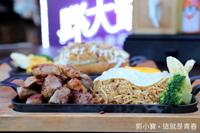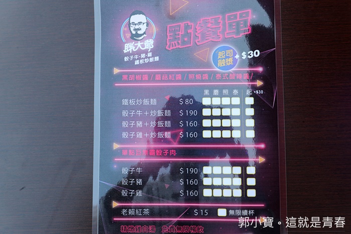 | 看了一下胖大爺的菜單其實並不複雜,但是其實搭配起來也可以算是很複雜,因為你不管點哪一份主餐都有四種口味可以選擇,所以每次來吃胖大爺都可以有不同的搭配風味,跟一般夜市牛排差不多,只是主食從夜市牛排的麵變成了炒飯麵,也可以單點炒飯麵,主要大類還是已雞豬牛為主,可以選擇搭配炒飯麵也可以單點肉品,搭配炒飯麵的話保證你可以吃到滿滿的飽足感。 |