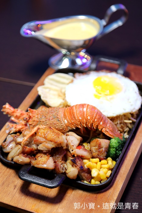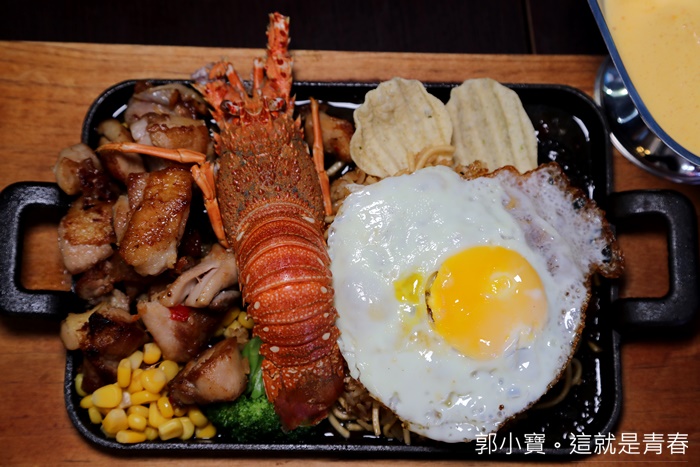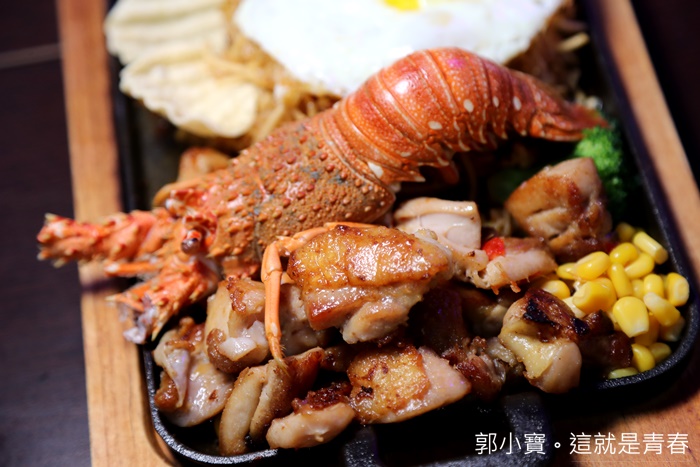 | 這一盤端上來的時候真的很哭杯,因為真的有夠無敵浮誇的阿,路邊攤有需要搞成這樣嗎?連龍蝦都上桌了,重點是價位還很便宜,只要點任何一套主餐加200元就可以獲得龍蝦一隻真的太狂了,海陸大餐讓你一次滿足,據說這還是隱藏版的餐點,本來我們也不知道,是因為店員跟我們說現在有隱藏版我們就點了一份,結果上來真的有嚇到我們。 |