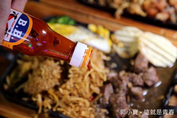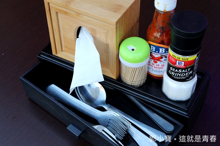 | 每個桌上都有放置餐具盒跟調味料罐,調味料罐主要是海鹽跟BB辣醬,我以為台中人都是用東泉辣椒醬,但是夜市牛排搭配BB辣醬真的是超搭的! |
