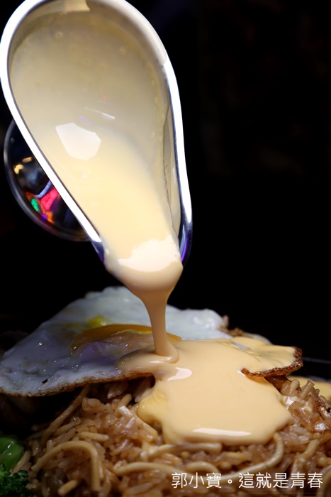 | 淋上起司醬的炒飯麵呈現完全不一樣的風味,你也可以先試試看倒局部,因為倒進去後整個炒飯麵就全部都是起司味了。 |