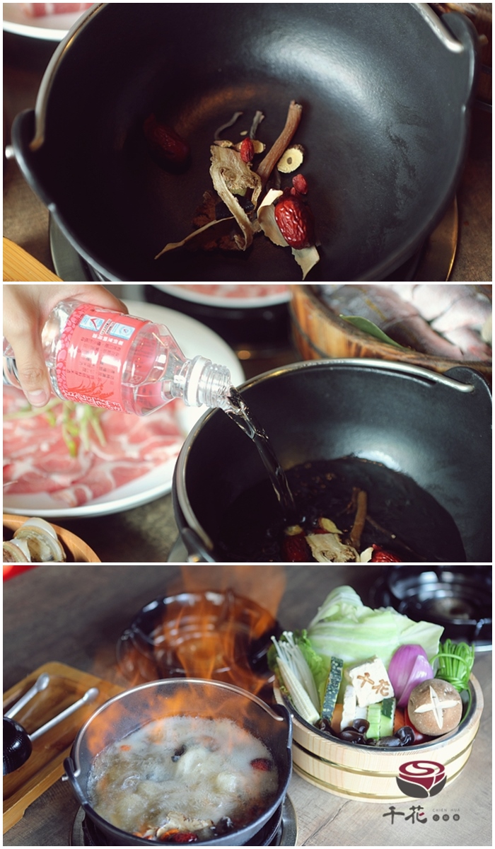 | 千花的燒酒雞會先放入它們配的中藥材然後再倒入一整瓶的米酒,想酒味濃一點的加米酒需要另外付費,我老爸就倒了兩瓶米酒,等湯稍微滾後工作人員就點火,瞬間大火熊熊的火焰秀就登場了! |