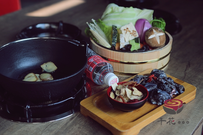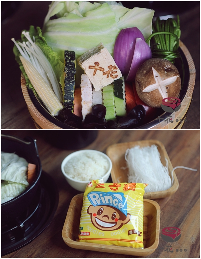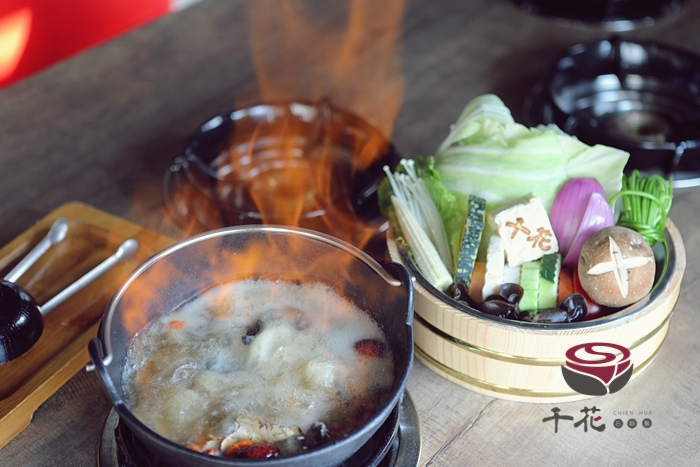 | 千花全部的火鍋都有附菜盤,菜盤的量還滿多的,種類也非常豐富,豆腐上面還有烙印千花兩字,附餐的選擇有白飯跟冬粉、烏龍麵還有王子麵四種,但是燒酒雞比較不一樣,燒酒雞搭配的是招牌麻油炸彈飯。 |