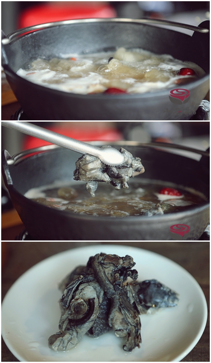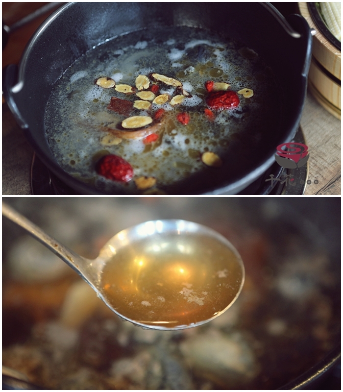 | 熬煮後的湯頭喝起來真的很甜,淡淡的中藥味加上米酒香氣跟烏骨雞燉煮完的精華,老爸還說要把吃完的雞骨丟下去繼續熬湯XDDD |