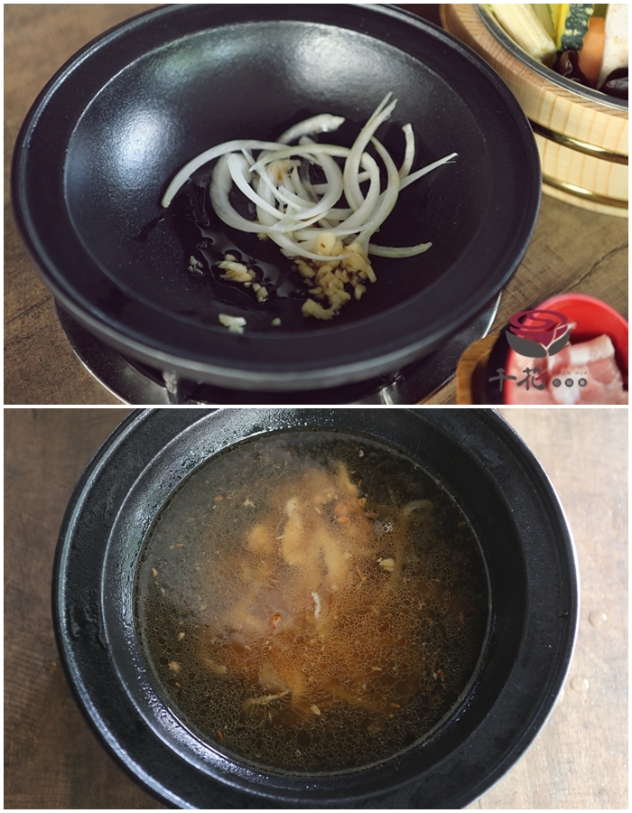 | 石頭火鍋是我媽跟我都愛吃的,有時候就是懷念這種石頭火鍋炒過的麻油香氣,我個人就是熱愛石頭火鍋的那個鍋氣,工作人員會幫忙先開大火把洋蔥、蒜末還有豬肉片放下去爆炒,炒到整個香氣出來後再倒入它們的豬骨高湯。 |