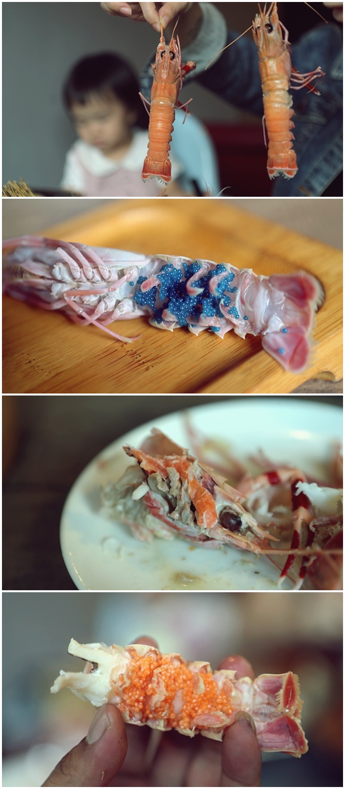 角蝦就屬於宜蘭頭城特殊的蝦種,當天這拚牌上面就五隻大角蝦以外,每一隻都還抱得滿滿的蛋,煮熟後每一顆蝦卵都超飽滿的(其實一開始看到角蝦藍色的蛋有點驚恐),而且角蝦的頭一定不能放過,裏面有一塊很像蟹膏的橙色塊超級好吃,蝦肉的部分非常彈牙。 |