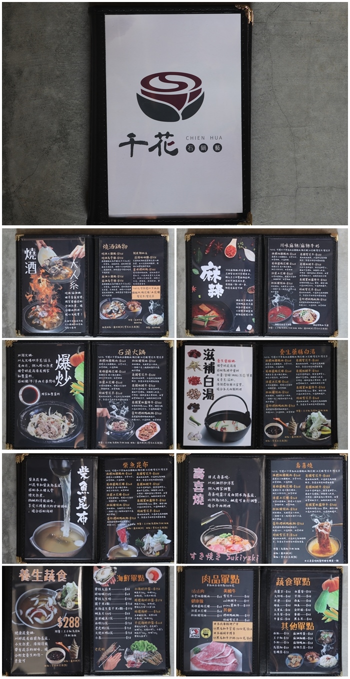 千花的菜單小小的一本,但是打開來裡面光是湯頭就讓我看到眼花撩亂了,是我目前看過最多湯頭的火鍋店了,加上我很推薦的原因就是,不管妳點什麼湯頭都不用在另外加價,其他火鍋店除了昆布以外點其他湯頭都要加價,而且千花也沒有收取服務費。