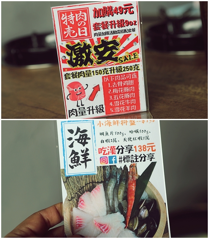 | 另外看到桌子上的立牌,加購49元就可以多選擇一種肉品100克,有一種雙拼肉品的感覺,另外打卡分享就可以用138元加購小海鮮拼盤,真的很划算,食量大的人很推薦加購。 |